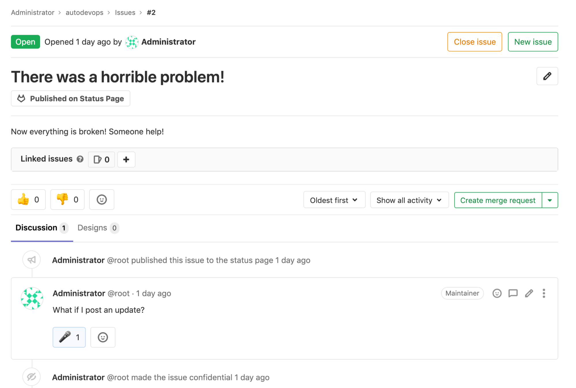 2. A project or group owner must use the /publish quick action to publish the incident to the GitLab Status Page. Confidential incidents can't be published.